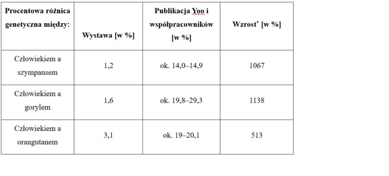 Jak widać w poniższej tabeli, wartości przedstawione w publikacji Yoo i zespołu są znacznie większe niż te, które obecnie prezentuje Wystawa. W przypadku porównania człowieka z szympansem oraz człowieka z gorylem rzeczywiste wartości procentowe różnic genetycznych podane przez badaczy są przeszło dziesięciokrotnie większe od tych prezentowanych na Wystawie: